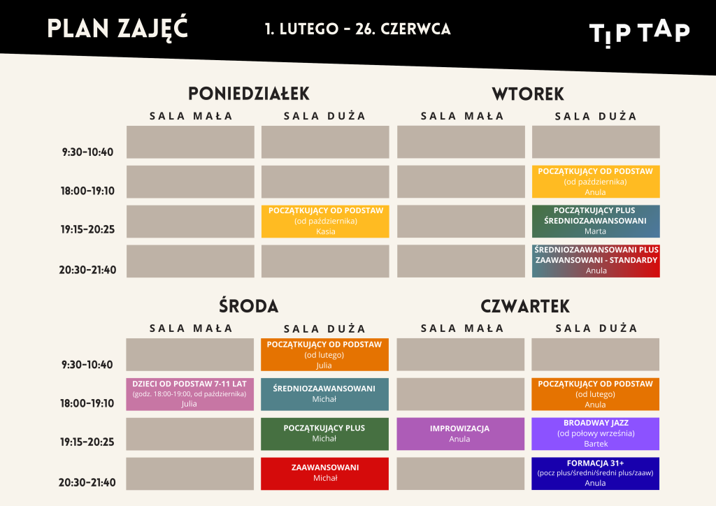 Od 1 lutego rozpoczynamy drugi semestr zajęć w Tip Tap! Oto grafik zajęć. Zapisy ruszają 15 stycznia!